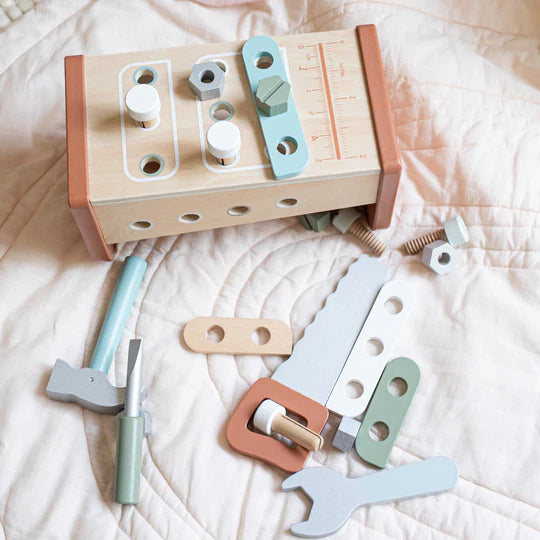 Turn playtime into a construction adventure with our Kids Toy Workbench that doubles as a Toolbox. Equipped with a hammer, saw, screwdriver, wrench, screws, and nails, it's just what your little builder needs to hammer out big ideas! Built tough for enthusiastic play, its compact design makes it easy to store and carry around. Screw in some imagination and build hands-on fun with this delightful gift for your mini carpenter! This toy is crafted from sustainably sourced wood from FSC® certified forests and coated with non-toxic, child-safe paint.
